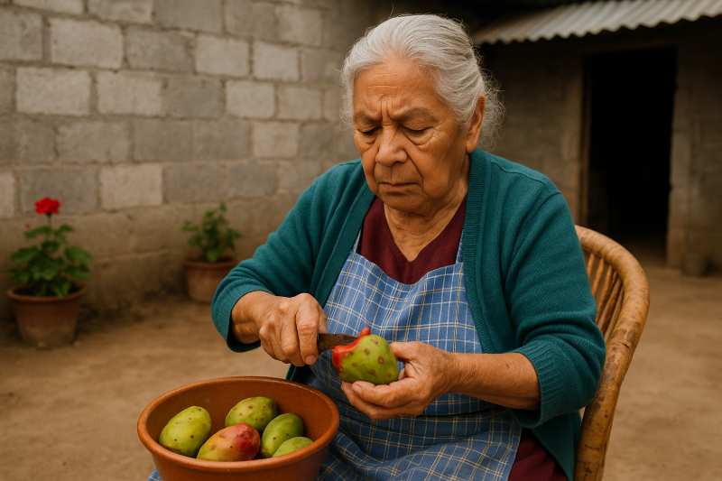 Con cuchillo en mano y más de media cubeta de tunas burronas por pelar