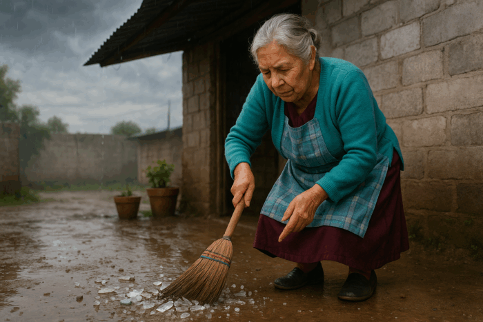 Por Doña Carmen, barriendo vidrios rotos en su patio tras la granizada