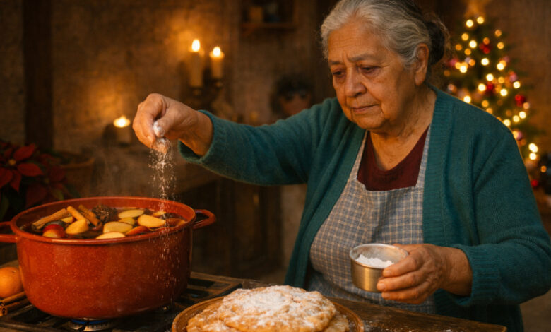 Por Doña Carmen, mientras prepara una olla de ponche y espolvorea buñuelos.