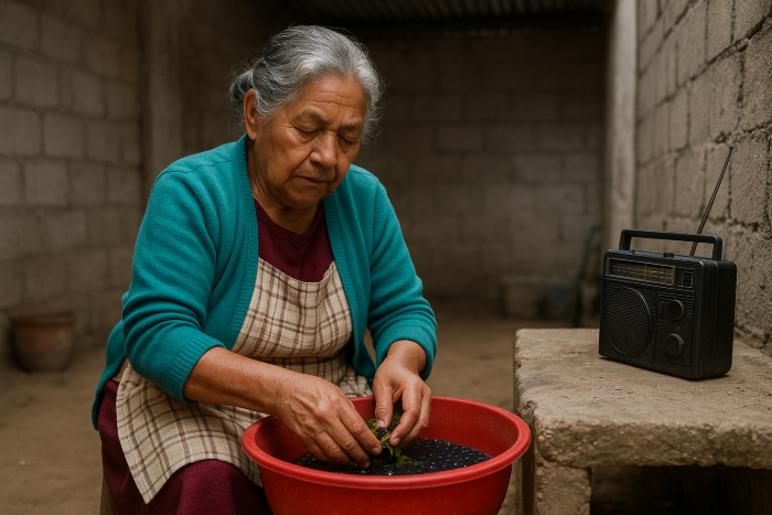 Por Doña Carmen, lavando frijoles en su patio mientras la radio escupe noticias.