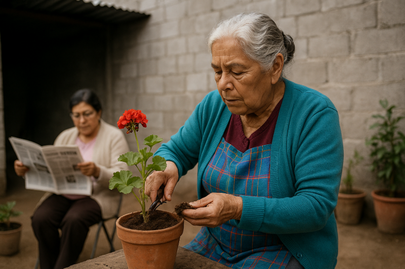 Por: Doña Carmen, podando un geranio en su patio mientras la comadre Chuy lee el periódico.