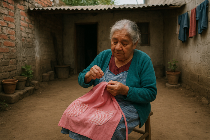 Por: Doña Carmen, mientras remienda un delantal en su patio de la Nezahualcóyotl.