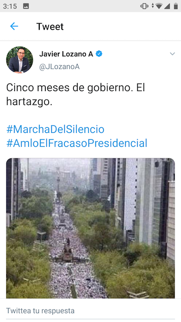 México.- El ex senador de la República Javier Lozano y el escritor Francisco Martín Moreno compartieron en redes una imagen errónea sobre la marcha de este 5 de mayo en Paseo de la Reforma en contra del presidente Andrés Manuel López Obrador, a fin de mostrar una asistencia mucho mayor a la que realmente convocó el evento.