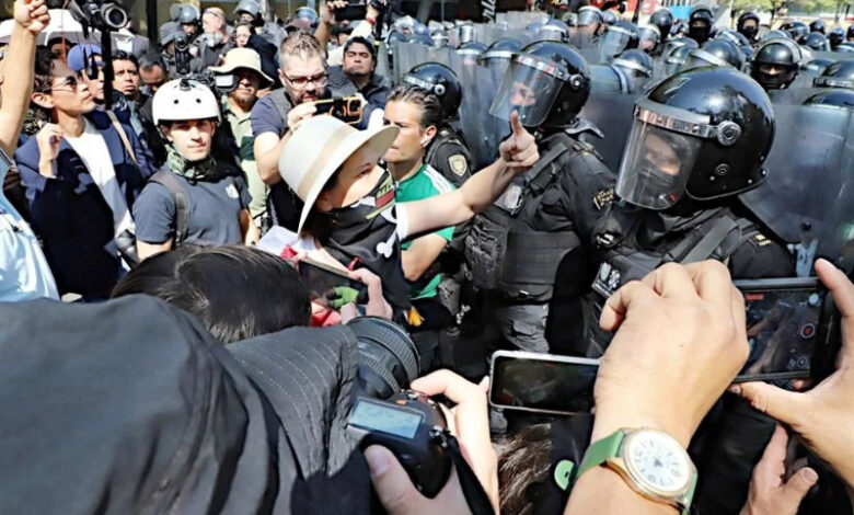 Sin embargo, al llegar al cruce de Palma y Cinco de Mayo, ya en el Centro Histórico y a escasos metros de la plancha capitalina, nuevamente se encontraron con un cerco policial. Las autoridades argumentaron que la logística del desfile aún no había sido retirada, por lo que el paso permanecía cerrado.