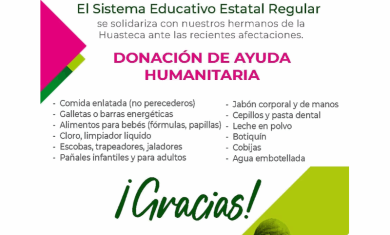 El DIF Estatal recibe donaciones en sus oficinas ubicadas en Nicolás Fernando Torres 500, colonia Jardín, mientras que el SEER instaló su centro de acopio en Prolongación Coronel Romero 660, Jardines del Estadio, donde personal, docentes y estudiantes participan activamente en la colecta.