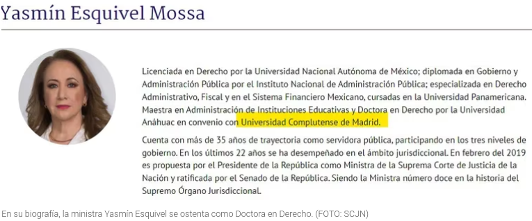 Sin embargo, en su semblanza presentada en la página de la Corte, Esquivel Mossa también señala que cuenta con título de Doctora en Derecho por la Universidad Anáhuac “en convenio con Universidad Complutense de Madrid”.