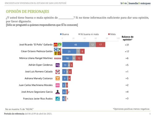 En cuanto a la ventana metodológica de esta encuesta de Buendía & Márquez, fue levantada del 6 al 9 de abril entre mil ciudadanos, hombres y mujeres, mayores de 18 años; se realizaron 300 en el municipio de San Luis Potosí y 700 en el resto del estado.